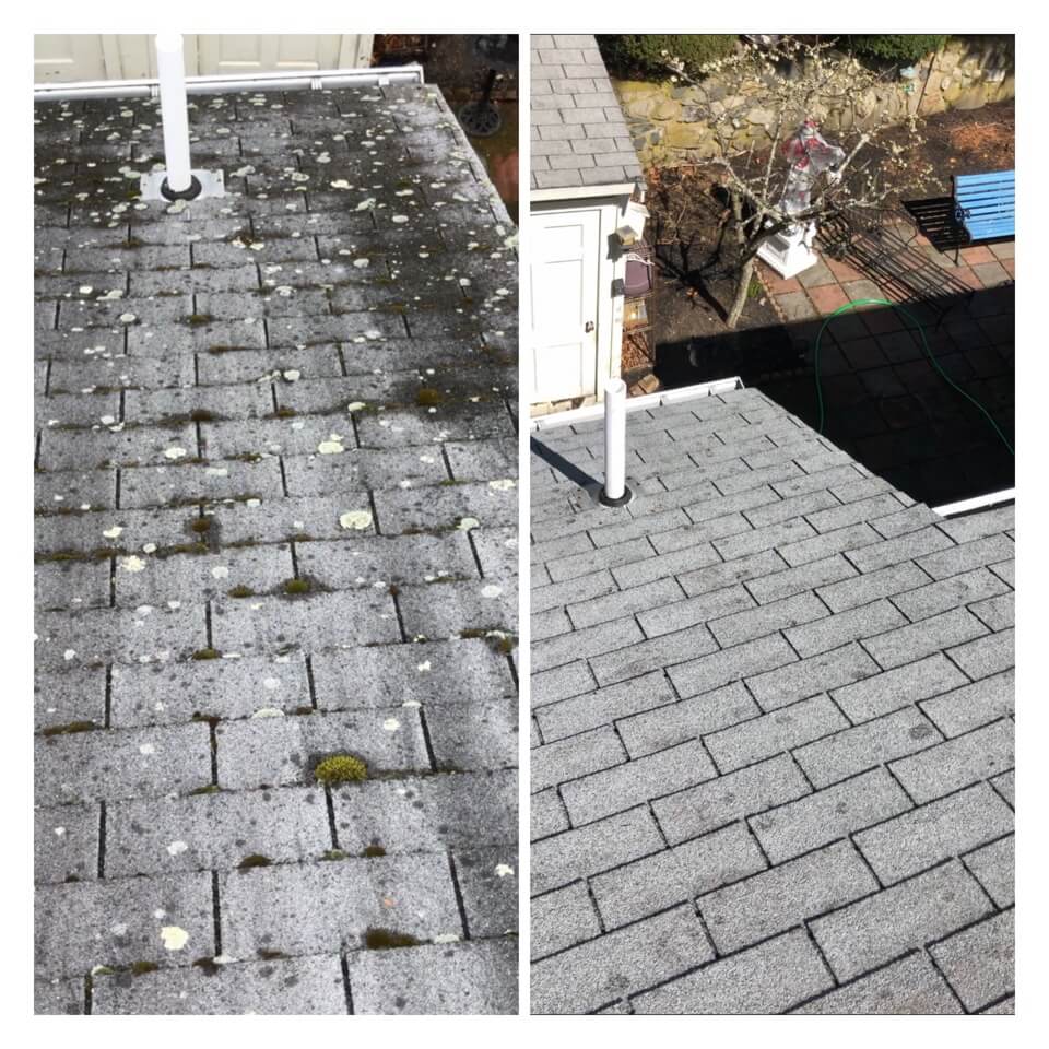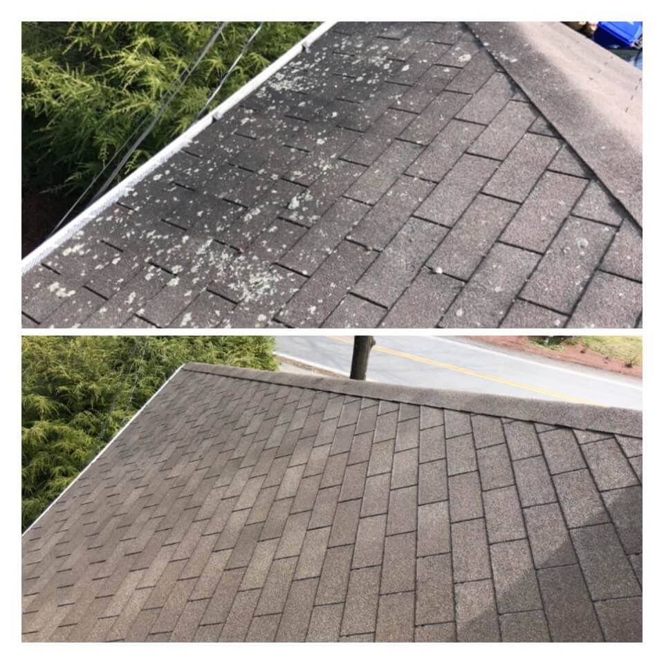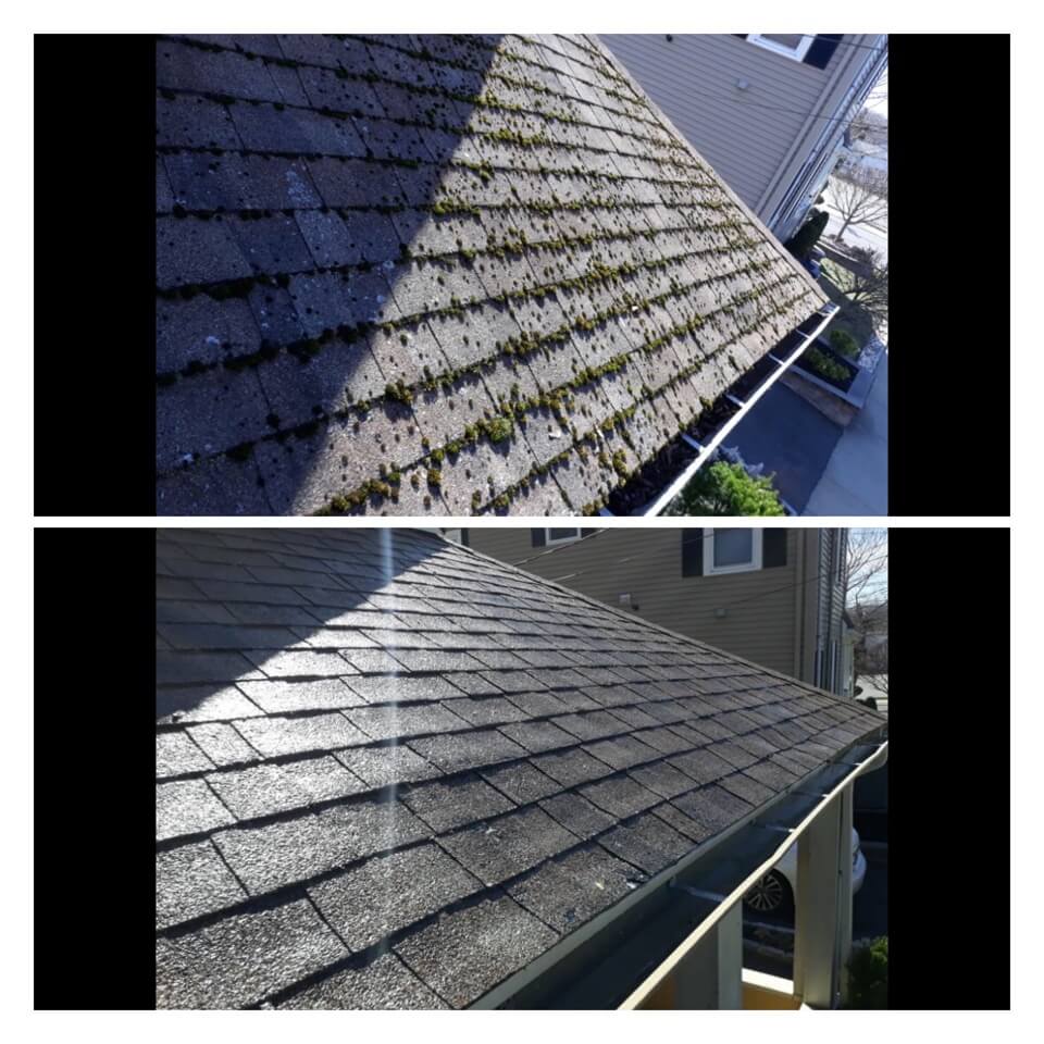 HiCleaners is the most experienced company in Stoughton, MA that deals with roof washing and roof soft washing. All of our employees are trained to recognize precise solution mixing ratios to provide you with the safest and most effective soft washing service. Roofs are a commonly neglected part of a house due to the fact that most people don’t have ladders to access it, so it is very easy to just leave it alone and forget about problems that may start to arise. Just like many home owners, discoloration and small bits of moss on a roof can be overlooked because of the misconception that it is just aesthetic. However, it isn’t just aesthetic, the moss slowly lifts the granules off the shingles which in turn shorten the life of the shingle. The moss also spreads, just like any bacteria if it is left alone for too long, it can quickly become a problem that spirals out of control. Call HiCleaners for a free quote, we only use the most advanced eco-friendly solutions and equipment to make sure the job is done right, for the safety of the employees, your plants, grass, pets, and children.