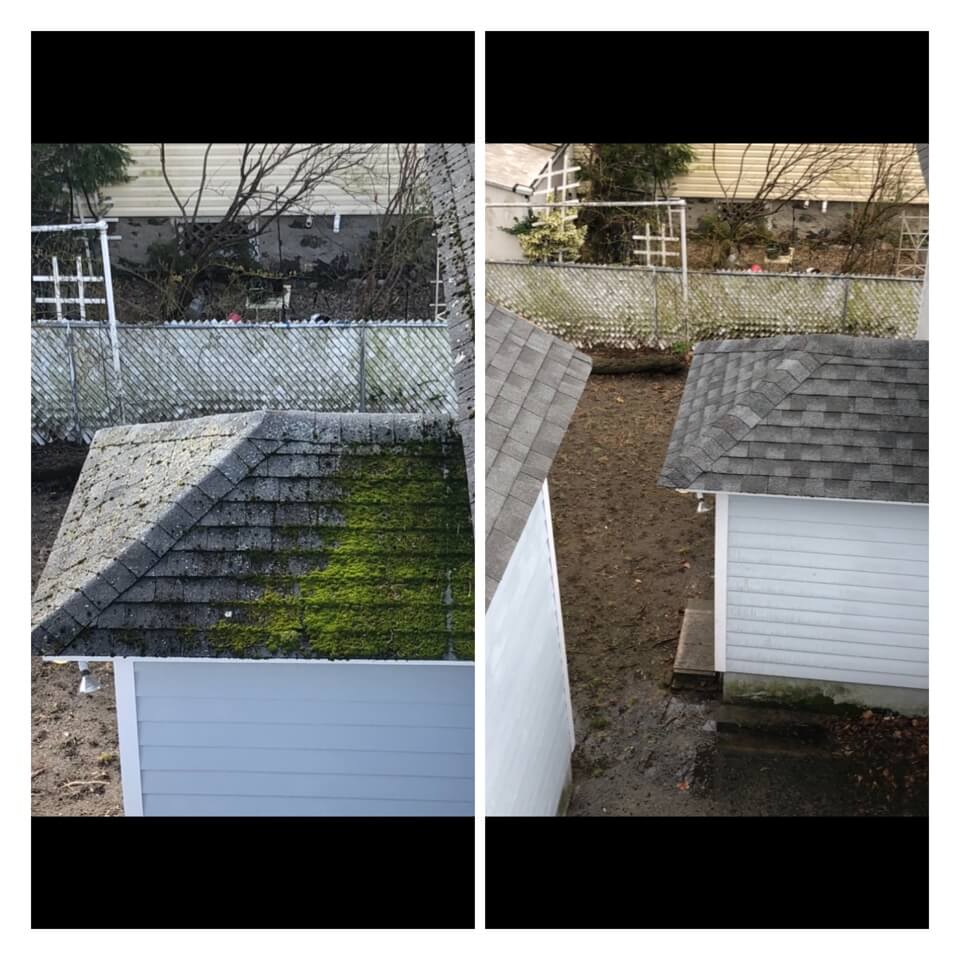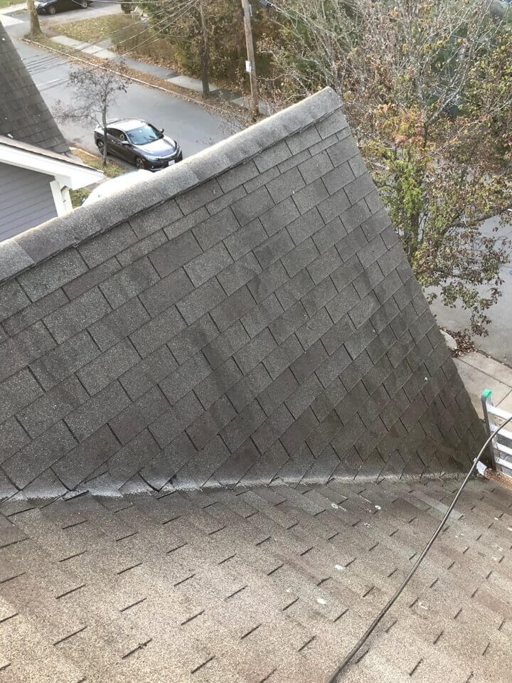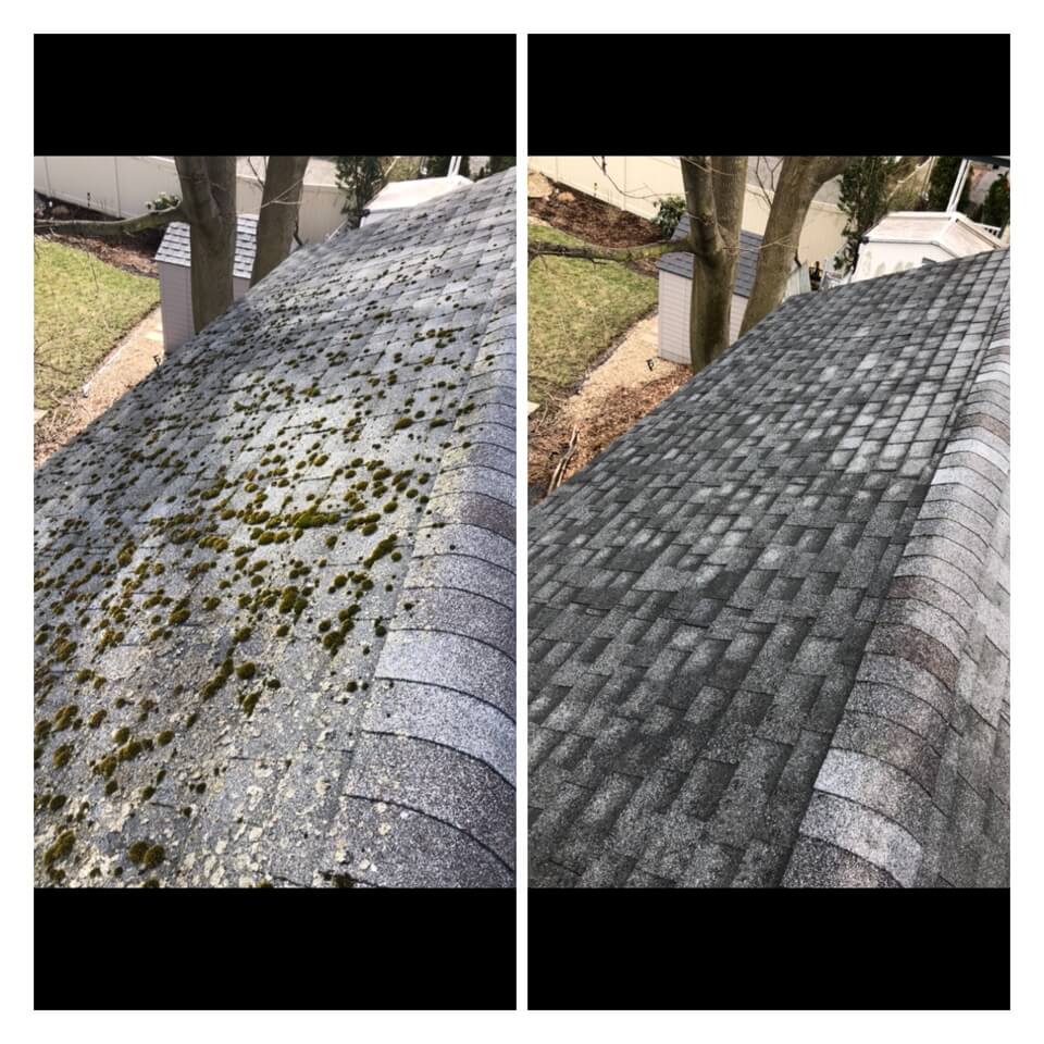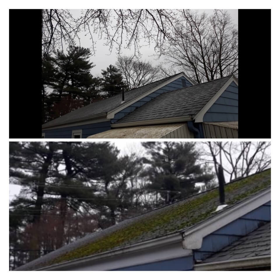 HiCleaners is the most experienced company in Stoughton, MA that deals with roof washing and roof soft washing. All of our employees are trained to recognize precise solution mixing ratios to provide you with the safest and most effective soft washing service. Roofs are a commonly neglected part of a house due to the fact that most people don’t have ladders to access it, so it is very easy to just leave it alone and forget about problems that may start to arise. Just like many home owners, discoloration and small bits of moss on a roof can be overlooked because of the misconception that it is just aesthetic. However, it isn’t just aesthetic, the moss slowly lifts the granules off the shingles which in turn shorten the life of the shingle. The moss also spreads, just like any bacteria if it is left alone for too long, it can quickly become a problem that spirals out of control. Call HiCleaners for a free quote, we only use the most advanced eco-friendly solutions and equipment to make sure the job is done right, for the safety of the employees, your plants, grass, pets, and children.